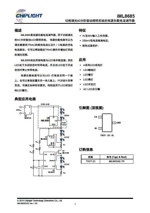 iML8685是有源负载电流调节器,用于切相调光的AC分阶驱动LED照明系统。有源负载电路可以为调光器提供TRIAC的维持电流以及R/C电路的充电电流路径。它可以帮助稳定TRIAC操作并增加灯系统的调光范围。