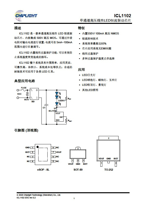 ICL1102 是一款单通道高压线性 LED 恒流驱动芯片,内部集成 500V高压 MOS。可通过外设电阻对输出电流进行设置,电流可在 5mA~100mA范围内进行任意调节。
