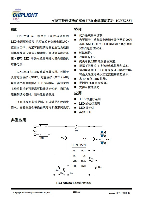ICNE2531是一款适用于可控硅调光的LED 电流驱动芯片,且可在较宽交流电压(AC)范围内工作。内置可控硅调光器的主动负载控制器和线电压调节补偿功能,可以调节流过高压(HV)IED 串的电流并同时为调光器提供维持电流。