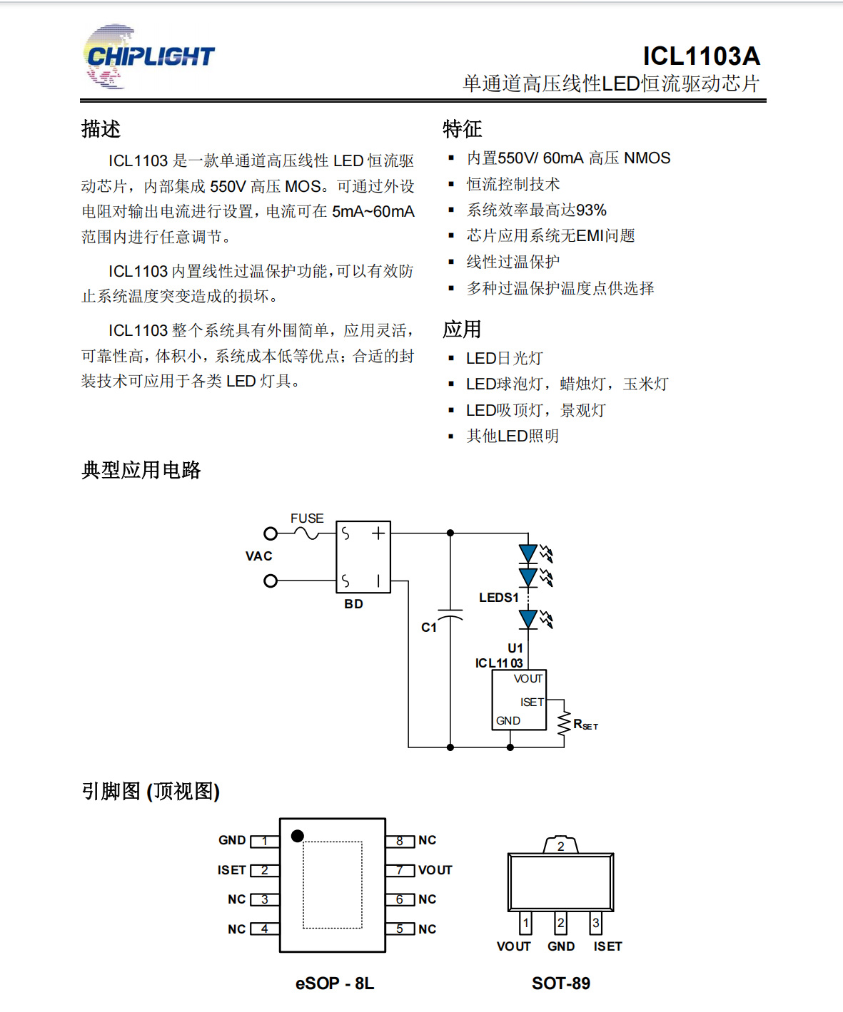 ICL1103 是一款单通道高压线性 LED 恒流驱动芯片,内部集成 550V 高压 MOS。可通过外设电阻对输出电流进行设置,电流可在 5mA~60mA范围内进行任意调节。