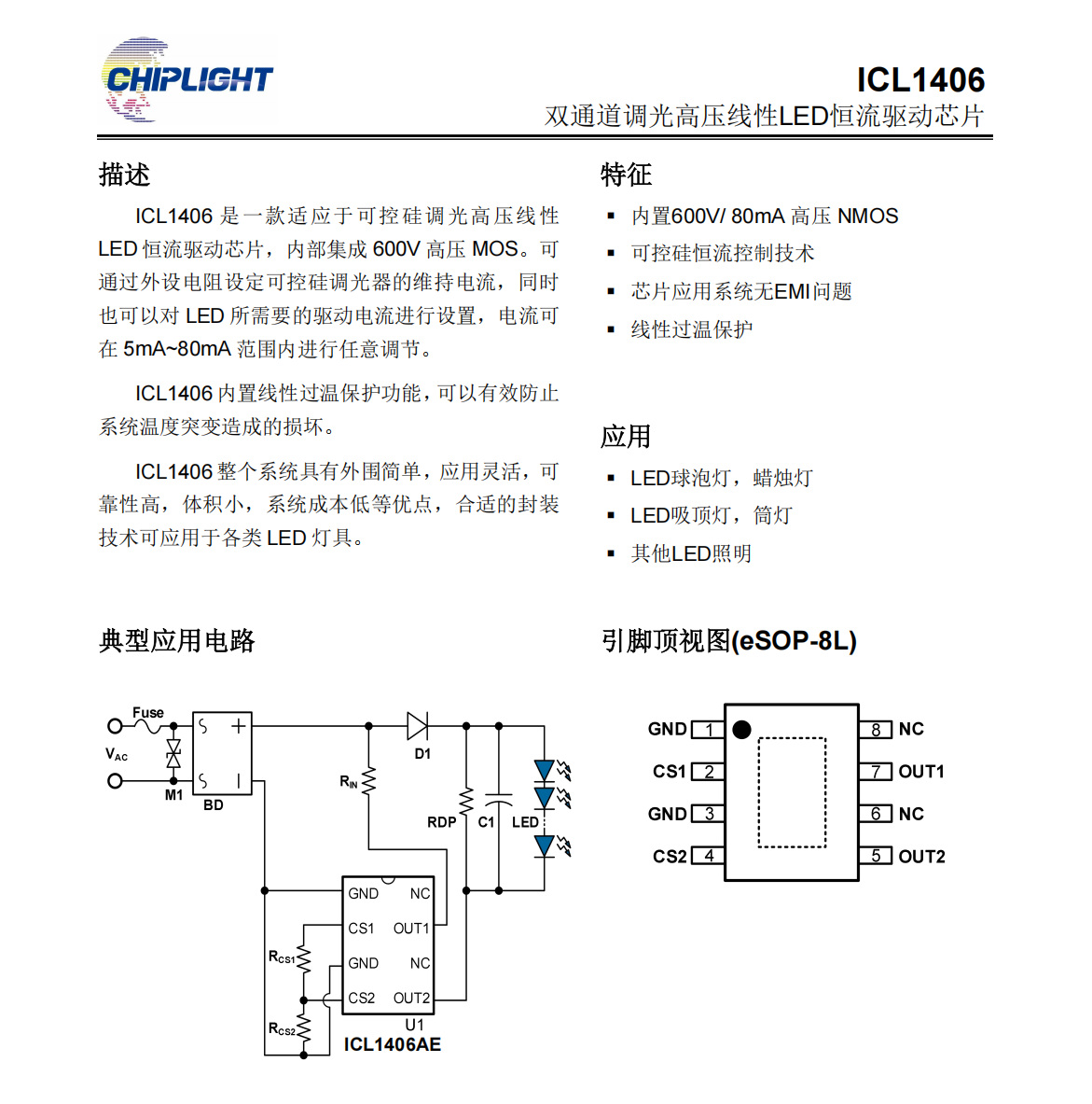 ICL1406 是一款适应于可控硅调光高压线性LED 恒流驱动芯片,内部集成 600V 高压 MOS。可通过外设电阻设定可控硅调光器的维持电流,同时也可以对 LED 所需要的驱动电流进行设置,电流可在 5mA~80mA 范围内进行任意调节。